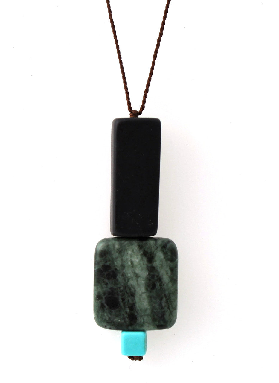 BLACKSTONE, GREEN JASPER AND MAGNESITE NECKLACE ON BROWN SILK