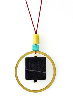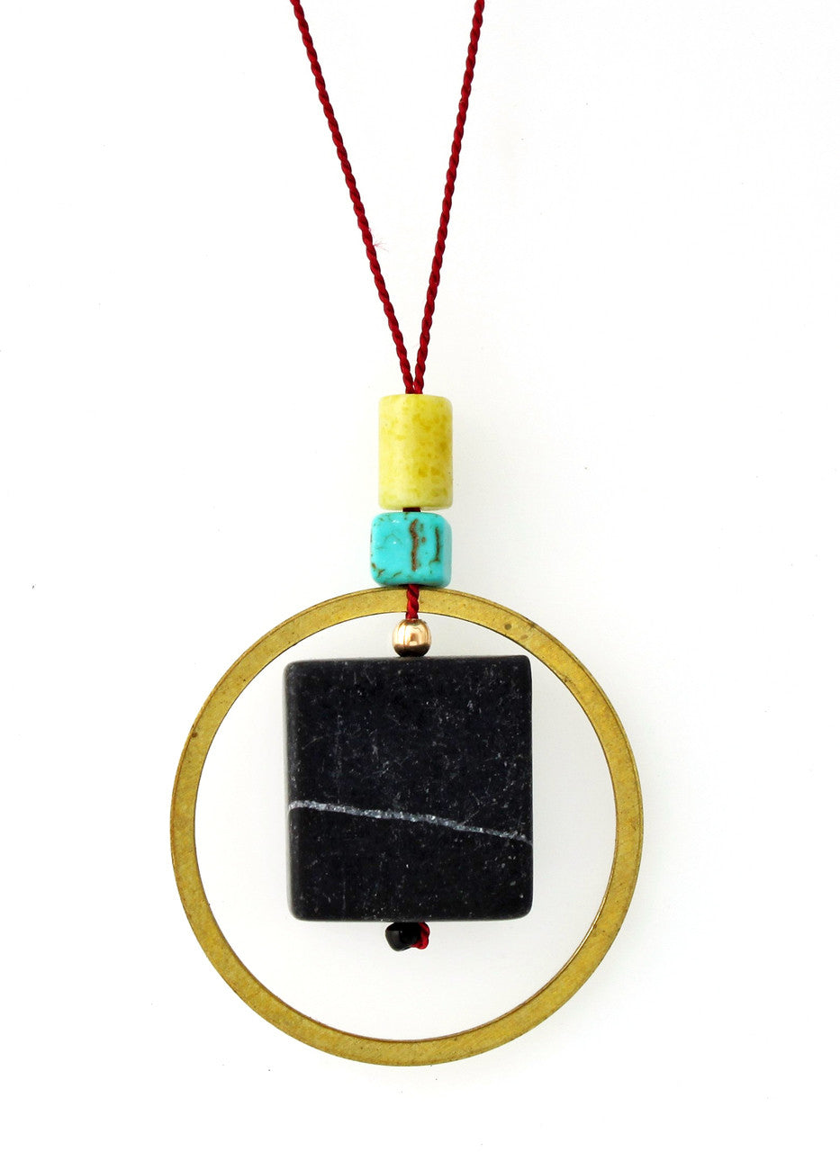 BLACKSTONE, PERIDOT JASPER, MAGNESITE AND BRASS CIRCLE NECKLACE ON RED SILK