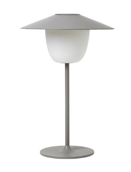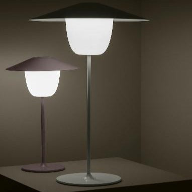 blomus ANI Lamp 3in1 Rechargeable LED is versatile, adaptable and brightly beautiful. The mobile LED lamp with matt colored powder coated aluminum can be used everywhere. The lamp can be used directly on the base, standing on the table as a traditional lamp, or hanging from the included rope. With a light touch of the lampshade, two brightness levels can be controlled or lamp can be switched off. For recharging, the lamp can be placed on the charging cradle and charged with the USB cable (both included). ANI is for outdoor or indoor use and is splash-proof. (Do not submerge in water). Run time is 8-16 hours on a charge, depending on brightness level used. Available in 4 colors: white, satellite (taupe), magnet (charcoal), and bark (rose/grey).
