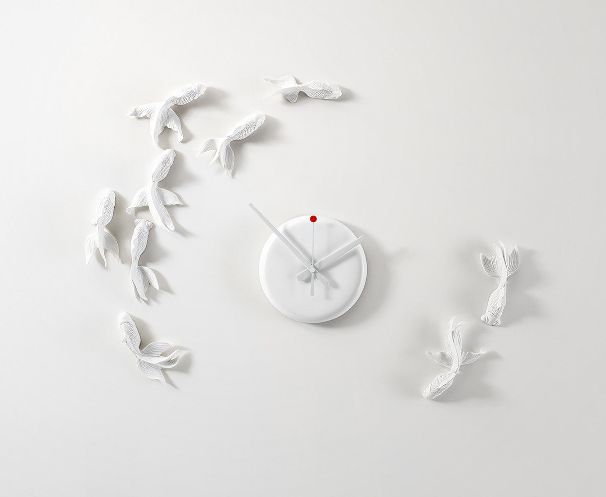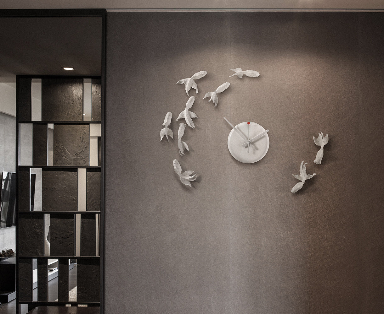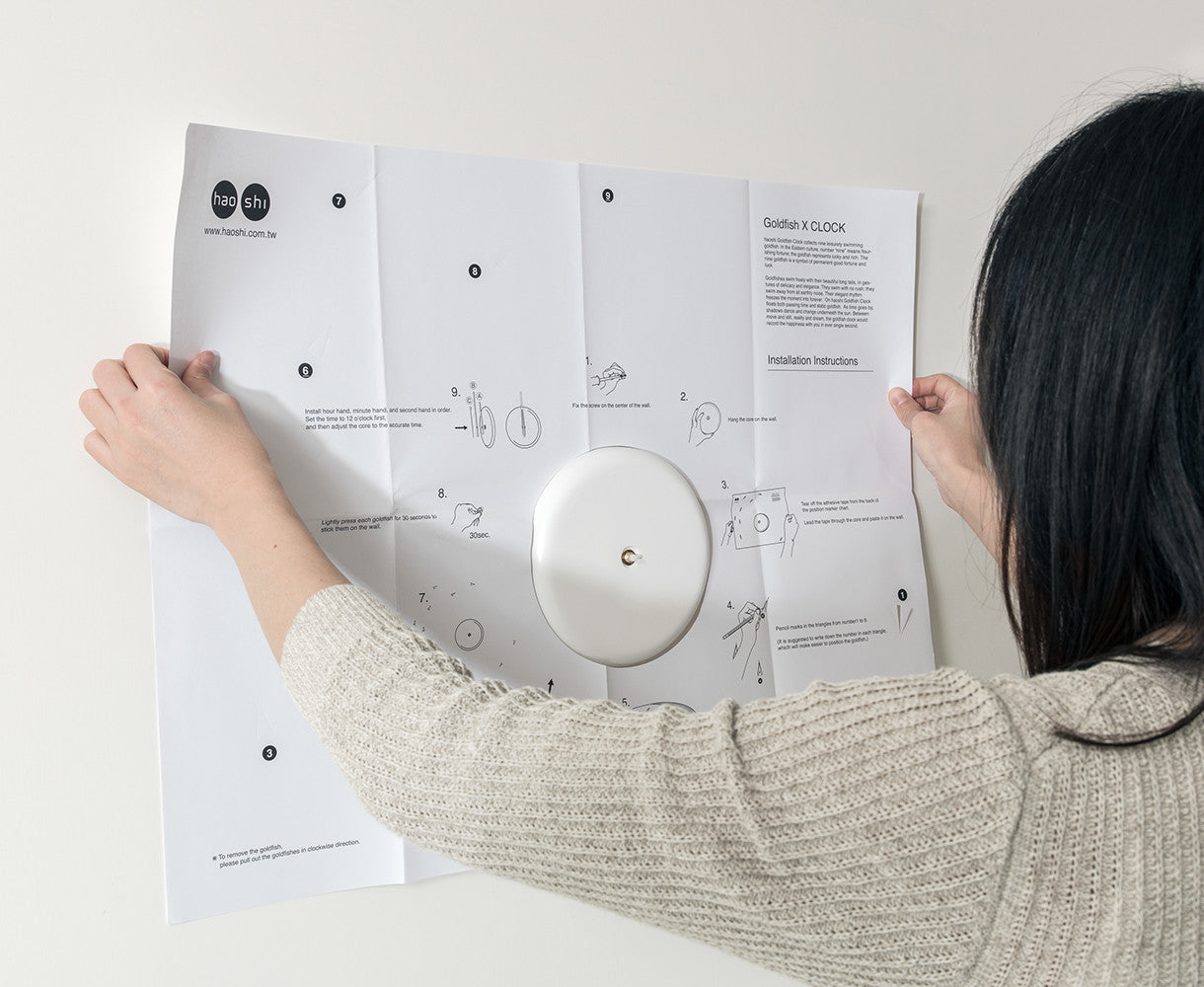 Material:Resin/Taiwan Movement.Dimensions: W100mm × D650mm × H650mmDesigner: Haoshi DesignHaoshi Goldfish X CLOCK collects nine leisurely swimming goldfish. In Eastern culture, number nine means flourishing fortune. The goldfish represents lucky and rich. Nine goldfish are a symbol of permanent good fortune and luck. Goldfishes swim freely with their beautiful long tails, in gestures of delicacy and elegance. They swim with no rush, they swim away from all earthly noise. Their elegant rhythm freezes the moment into forever. On haoshi Goldfish Clock floats both passing time and static goldfish. As time goes by, shadows dance and change underneath the sun. Between move and still, reality and dream, the goldfish clock would record the happiness with you in ever single second.Installation:The back of each goldfishs tail is numbered. Please tear off the adhesive tape and paste it on the marks in order.Tear off the adhesive tape from the back of the position marker chart. Lead the tape through the core and paste it on the wall.