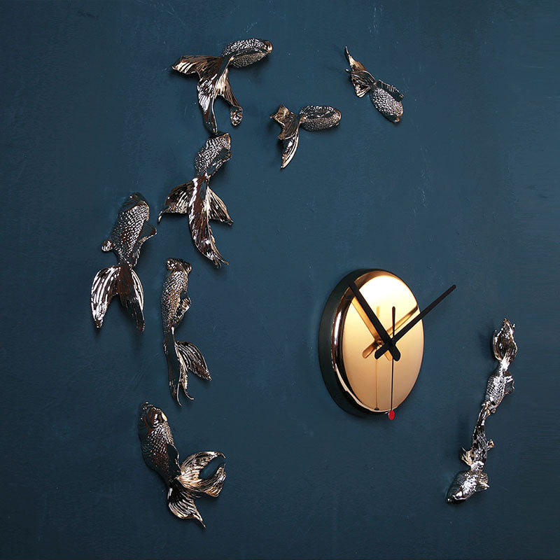The pieces are made of matte white resin, hand-gilded and hand-finished for details and can be easily applied to any surface. A pattern is enclosed for the simple installation. Between movement and stillness, reality and dream, the goldfish wall clock would record happiness with you in every single second.