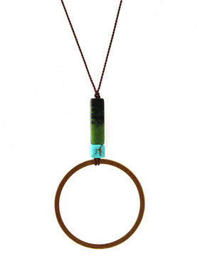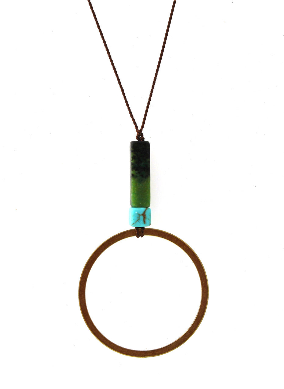 MAGNESITE WITH BRASS CIRCLE NECKLACE ON BROWN SILK