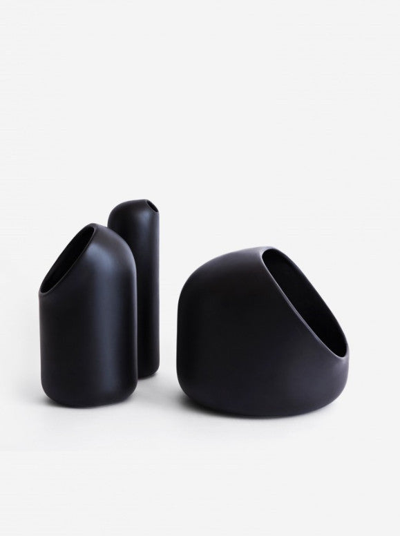 Ô is a family of accessories made out of clay and compound by a vase, a jug and a basket. Alone or as a trio, always expressives, they seem to sing, scream their lungs out or chat ... Stocky, slim or plump ... Their morphology is very singular but they are linked by a generous and strong look.