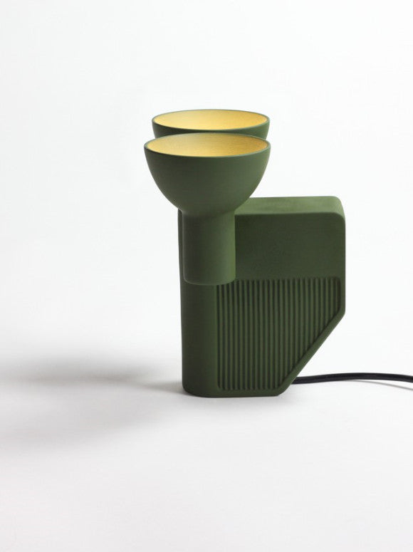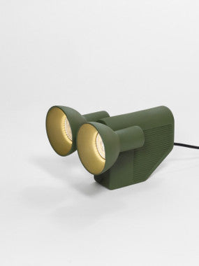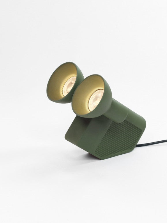 3 lighting positions table lamp. Small, compact, fitted with 2 Led bulbs, OLO can be adapted to all types of situations and fits in anywhere. At ease beside the bed, on the ground, on a table, in a library or on a shelf, three lighting positions allow it to be moved backwards and forwards to light horizontally, vertically and at 45 degrees and be an ideal solution to create diffused atmospheric lighting or, on the contrary, directed beam angle lighting to emphasis the most confined and specific areas. A genuine tool with a resolutely technical design, OLO however has an affable and benevolent character. A reference at the same time to certain well-known personages in the animated film world, to military exploration objects or again to a Super 8 camera, in one dense and positive design, it focuses multiple origins in which everyone can project their own references, their own history. At a time when the majority of so-called technical lamps are made of plastic, OLO choose to commit itself to ceramics. Using acquired techniques and ancestral know-how, it establishes its modernity in a manufacturing process and a formal and resolutely contemporary vocabulary.