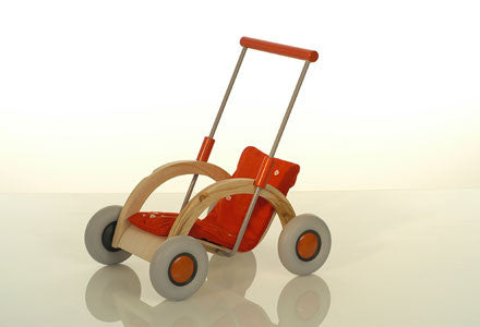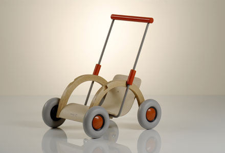 Troll can also be limitedly used as walker, but it is not as tilt-safe as the therefore designed Sibis walker “Schorsch”. That is the reason why only the last one has been MOT proved for the walking training. But a tilting or rolling away of the doll’s pram Troll can be avoided by weighting the seat down when the walking training begins.